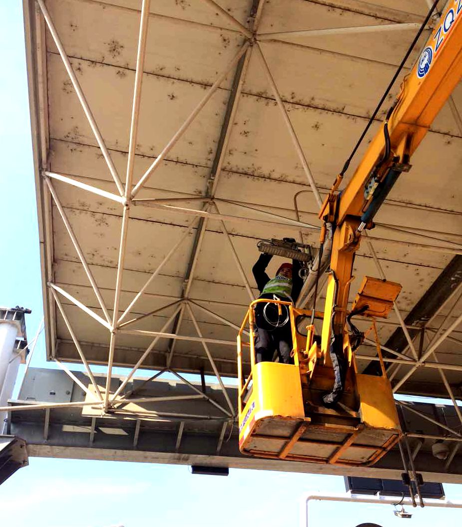 圖為隊員正在更換車道頂棚燈 期間在臺州南收費所發現有兩個車道出現異常,即當重型車輛通過時,輪檢鐵板和稱臺出現不正常晃動情況。根據以往經驗,此情況如不進行及時維修,對車輛計重將造成嚴重影響。對此,技術人員不僅對鐵板上每顆螺栓都進行了認真細致的重新加固,之后不厭其煩對每個稱臺限位都進行了多次調整,直至將晃動幅度控制在正常范圍內。