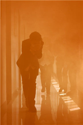 圖為參演人員在火災演練中有序撤離