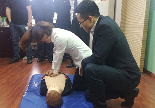 圖為參加培訓的人員 本次培訓特別邀請杭州五進健康管理服務中心湯瑞芳老師到場授課,為大家講授意外事故急救方法與步驟,職業病、慢性病預防等知識。授課過程中,參訓人員彼此互動,并利用CPR假人模型實踐現場急救,根據參會員工的實際情況現場演示職業病、慢性病的檢查與防治方法,課程氣氛熱烈。